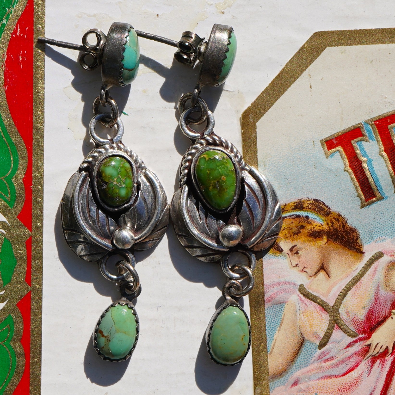 Navajo earrings with a leaf design featuring Mojave turquoise and Sonoran Gold Turquoise.