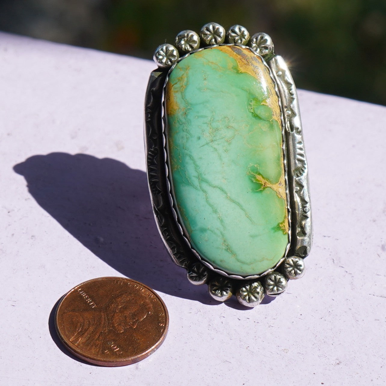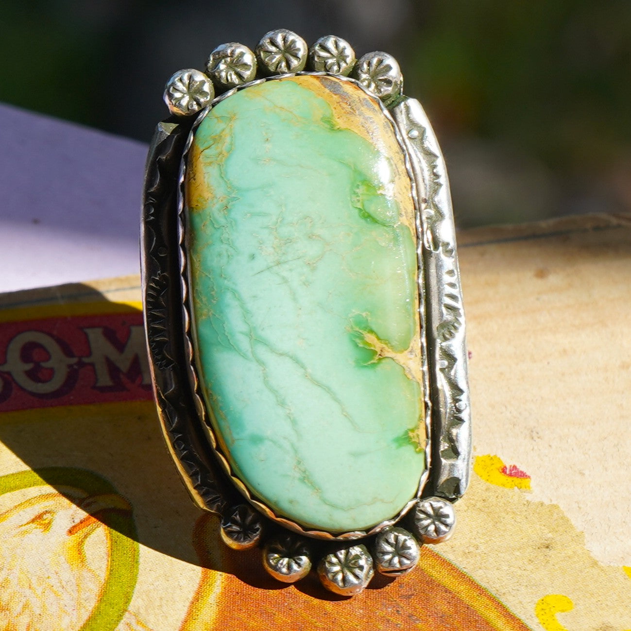 Vintage Navajo ring featuring large light green Royston turquoise stone.