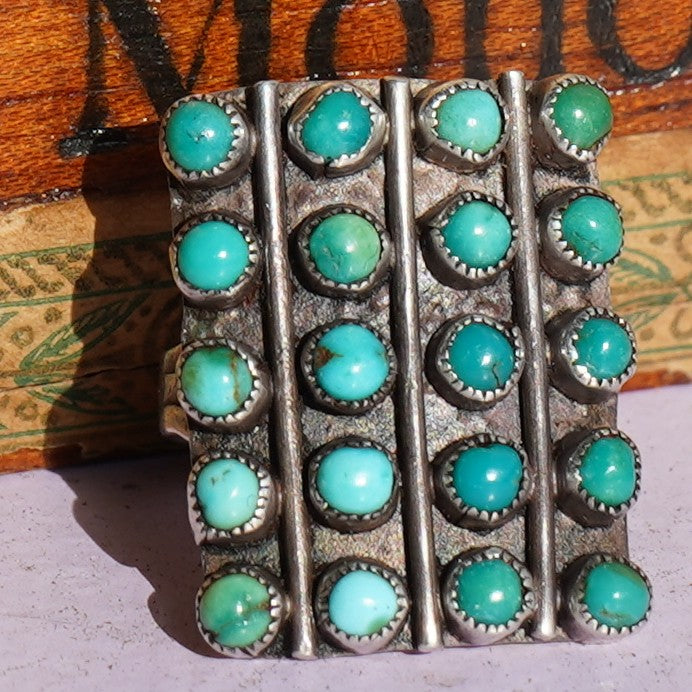 Charming vintage Zuni ring featuring blue and green snake eye turquoise.